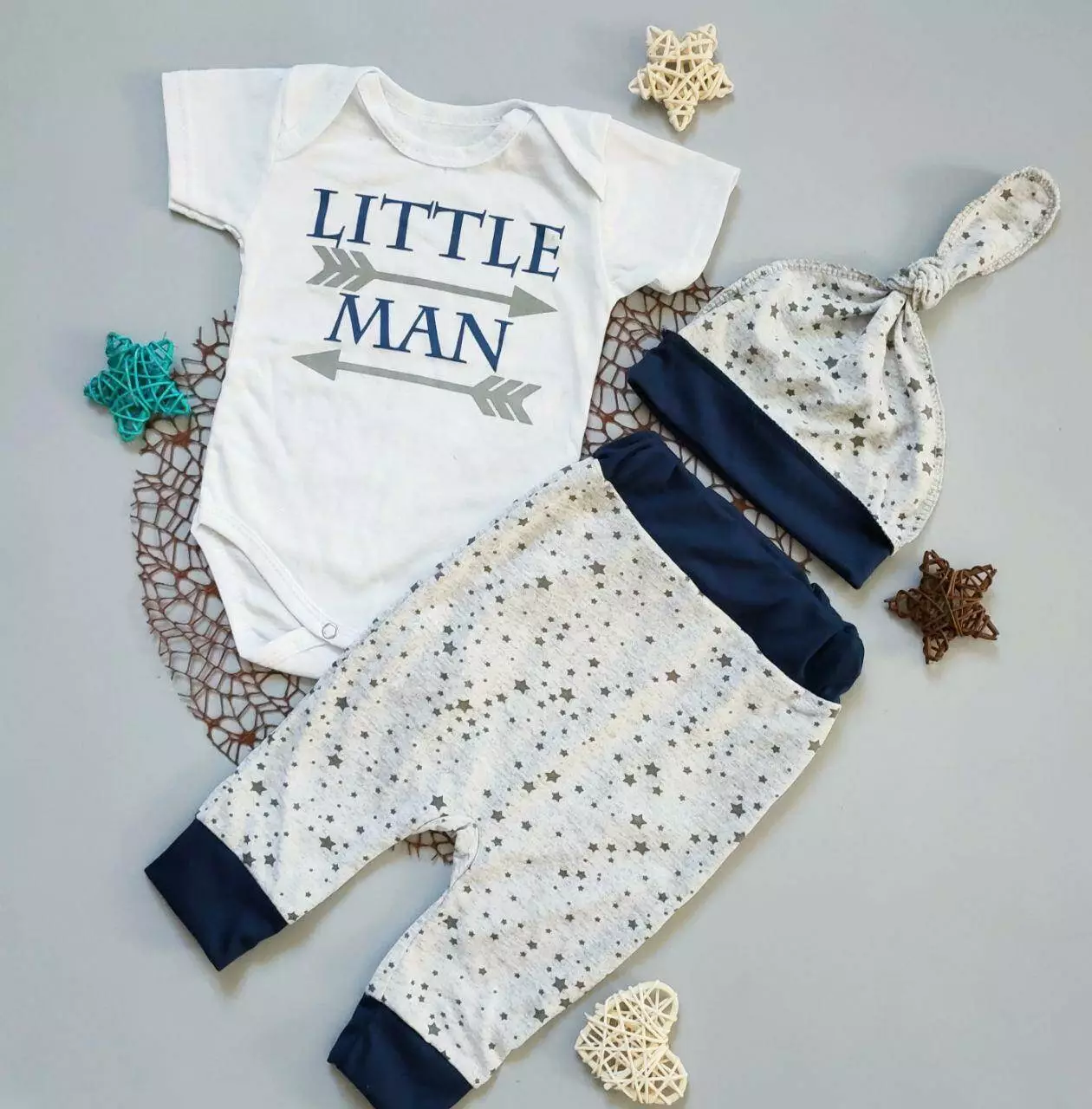 В комплект входят боди с коротким рукавом, мягкие штанишки и удобная шапочка-узелок. Материал — кулирка (100% хлопок) — дышащая, натуральная ткань, идеально подходящая для новорождённых ????