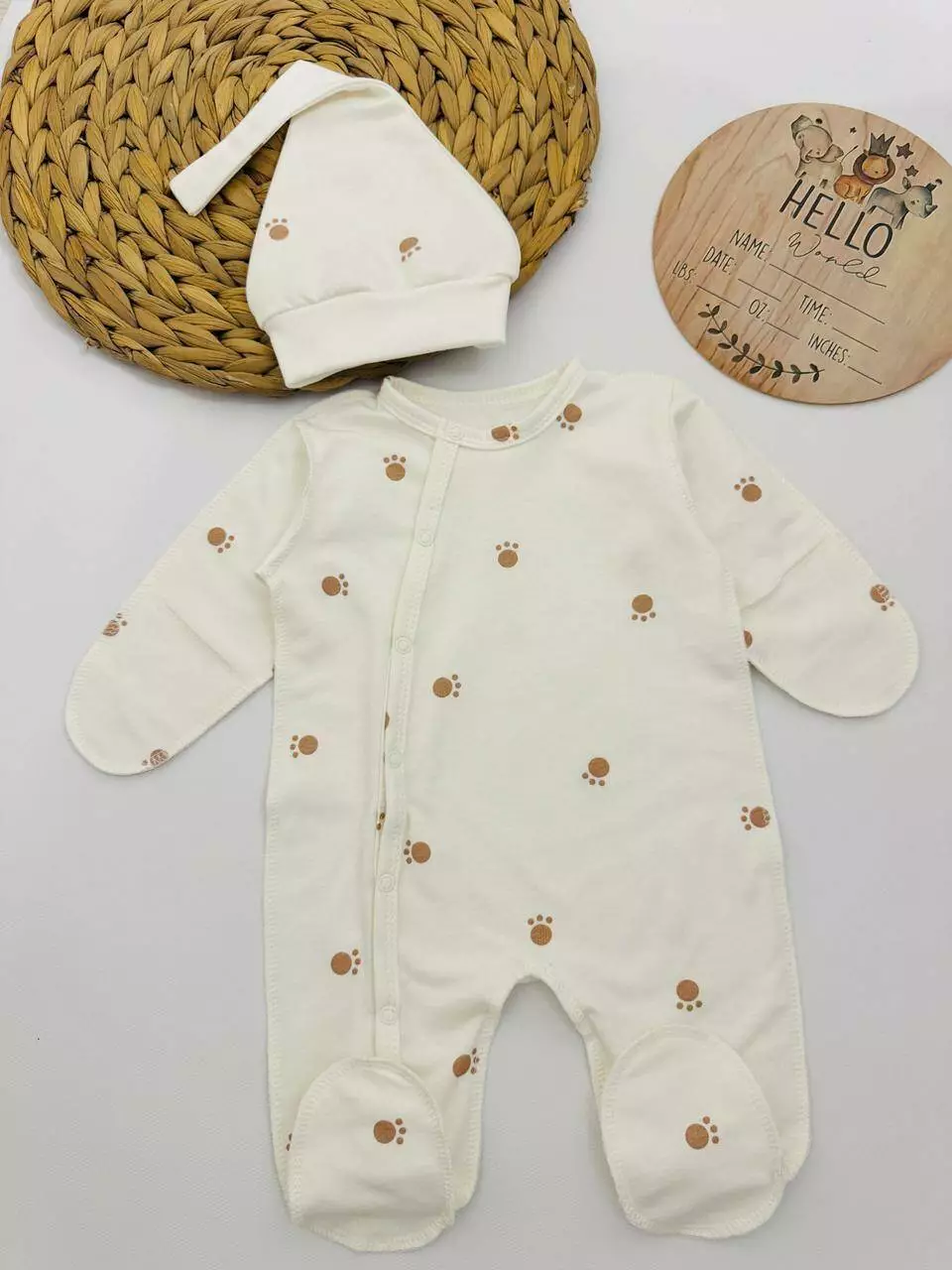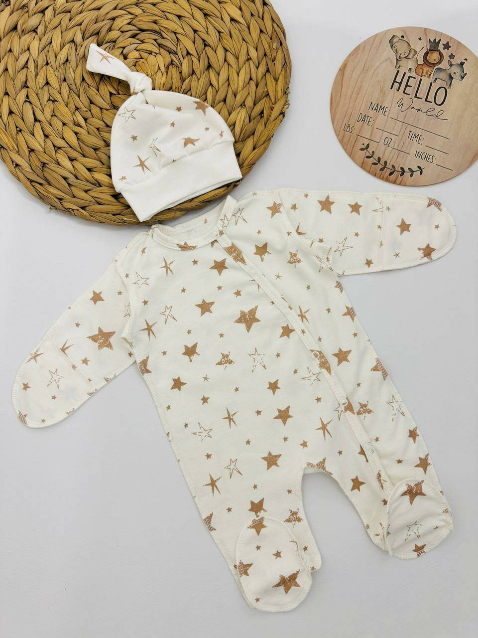 Ищете тёплый и удобный комплект для малыша? Представляем практичный и мягкий комплект из футера с начёсом, в который входят человечек с длинными рукавами и закрытыми ножками, а также шапочка. Идеально подойдёт для холодной погоды, прогулок, сна и даже выписки из роддома.
