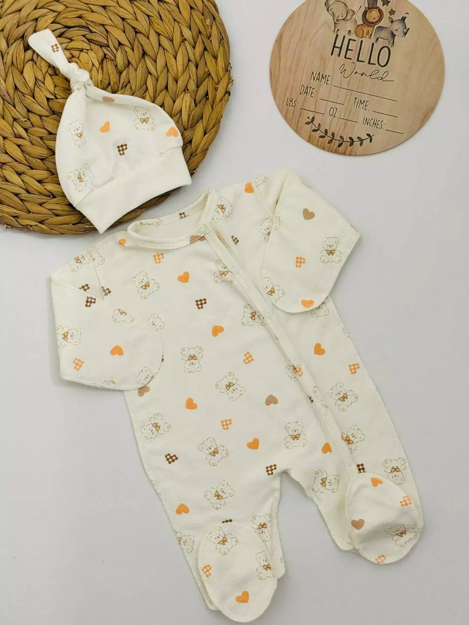Ищете тёплый и удобный комплект для малыша? Представляем практичный и мягкий комплект из футера с начёсом, в который входят человечек с длинными рукавами и закрытыми ножками, а также шапочка. Идеально подойдёт для холодной погоды, прогулок, сна и даже выписки из роддома.