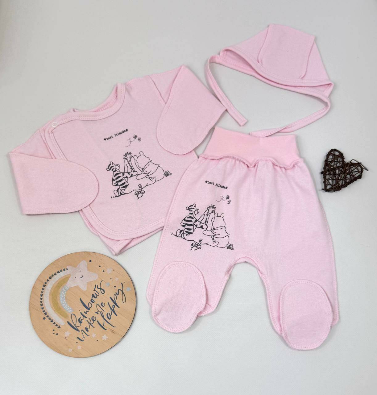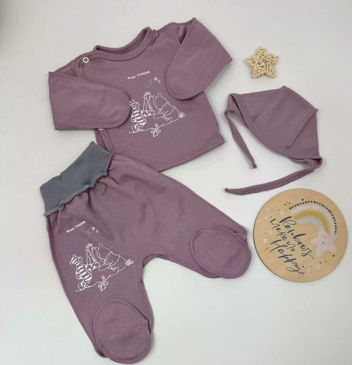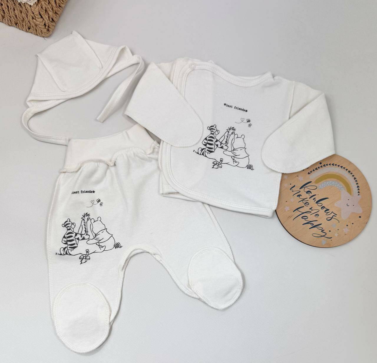 Набор из трёх базовых вещей для новорождённого — отличное решение для повседневного использования, сна и прогулок. Мягкий футер защитит малыша от холода и обеспечит комфорт. Идеально подходит для роддома и первых недель ????