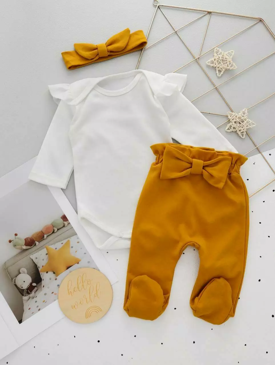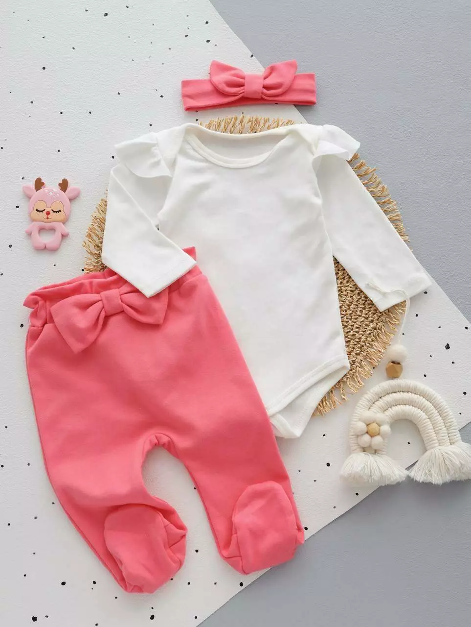Мягкий и удобный комплект для новорождённой девочки пошит из натуральной хлопковой ткани интерлок, которая идеально подходит для чувствительной кожи малыша. Хорошо дышит, не вызывает раздражений и подходит для повседневного ношения и на выписку.