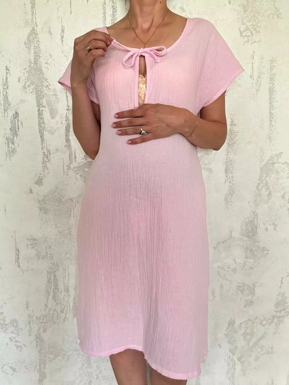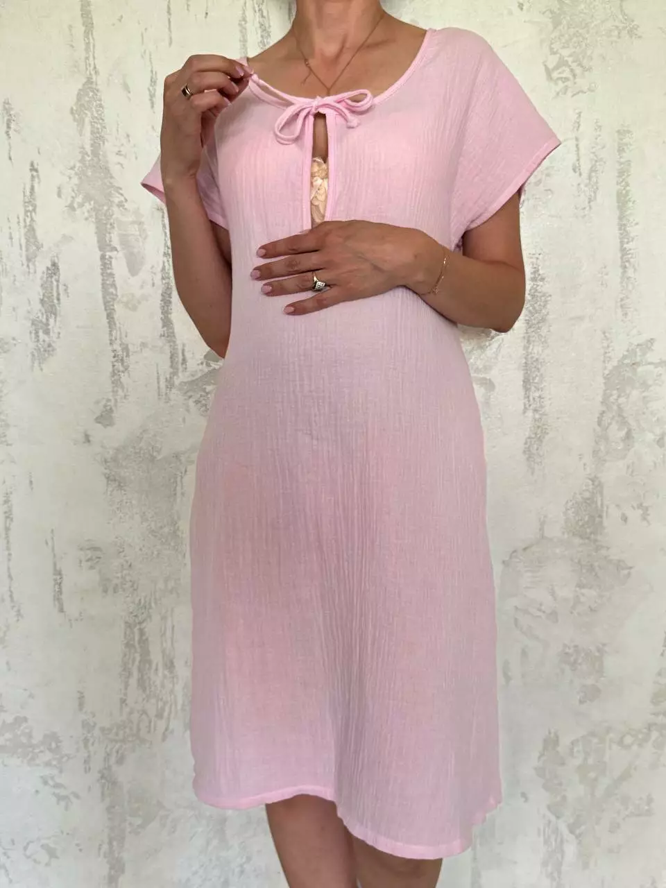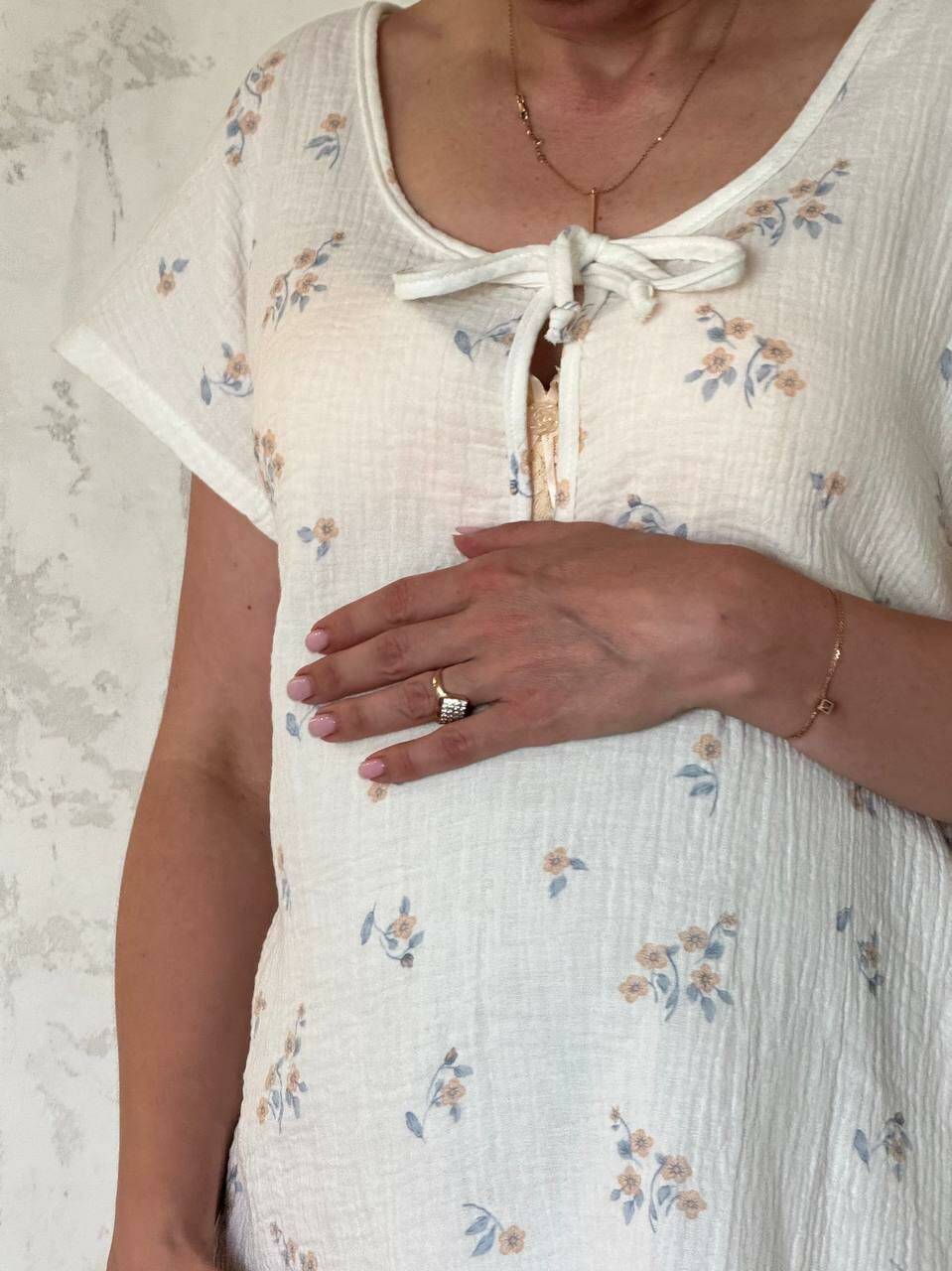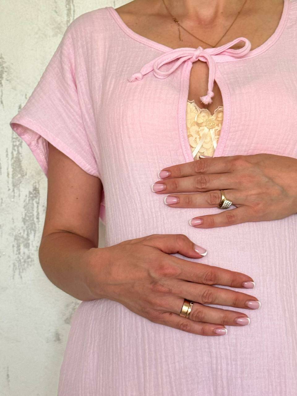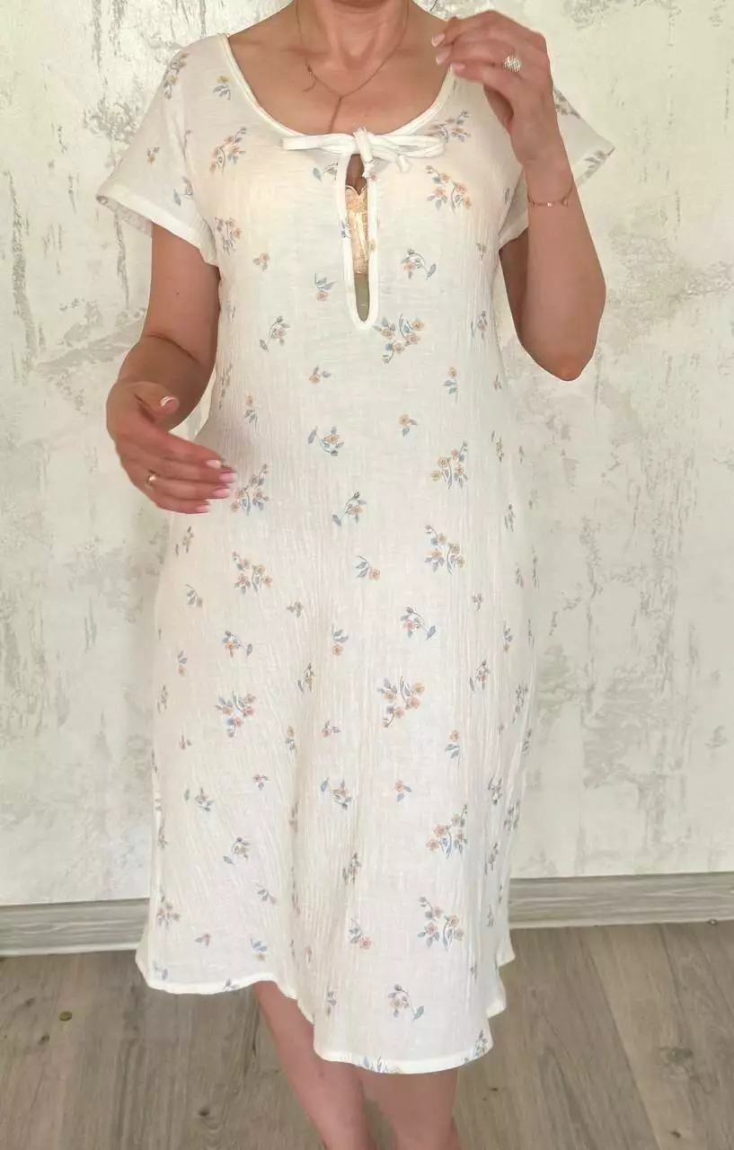 Легкая и удобная ночная сорочка из жатого муслина — отличный выбор для будущих и молодых мам. Благодаря удобной завязке в зоне груди, модель чудово підходит для ночного кормления малыша. Свободный крой обеспечивает полную свободу движений, что особенно важно во время беременности и в период восстановления после родов.