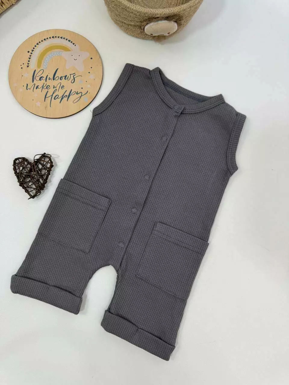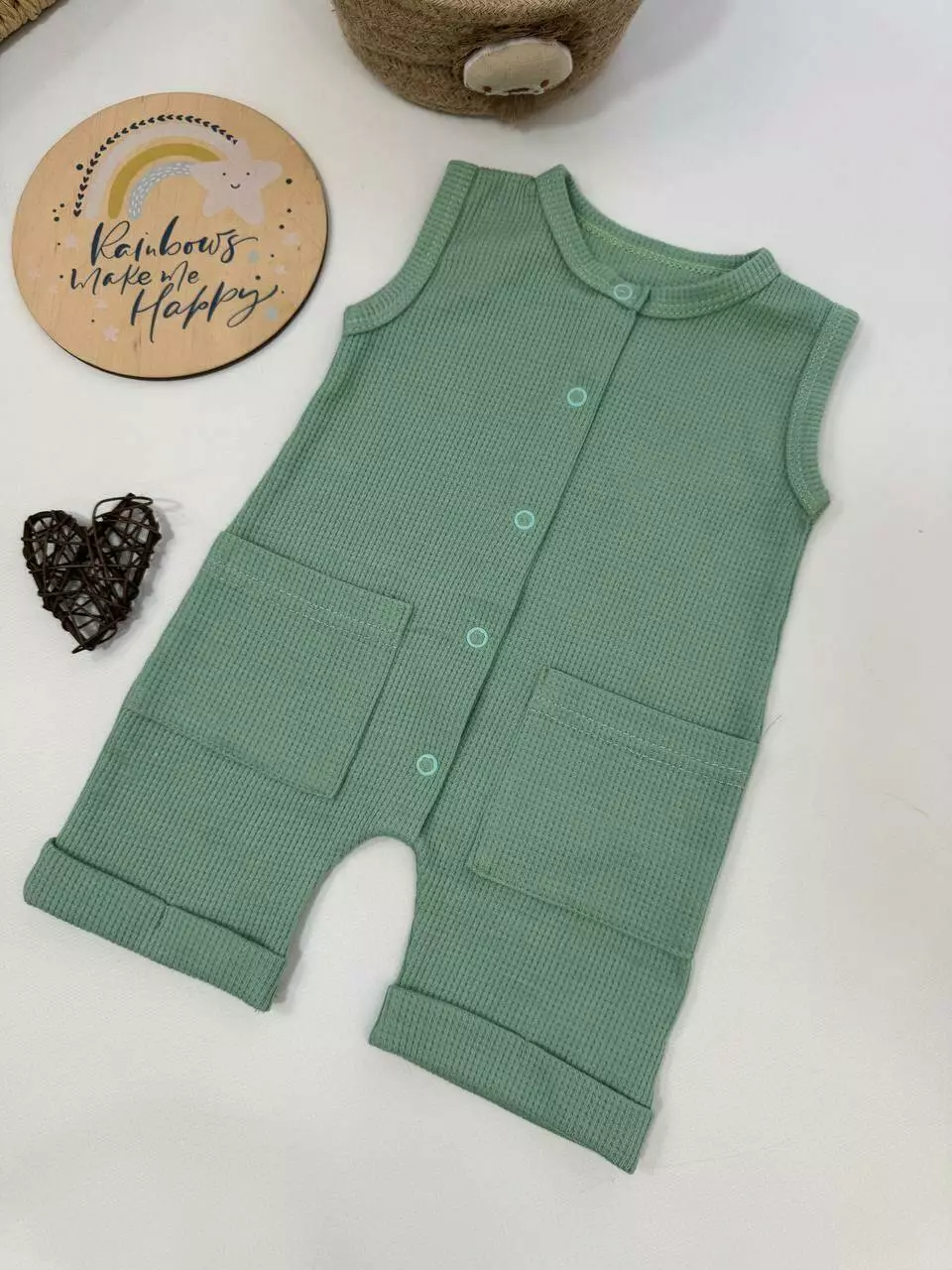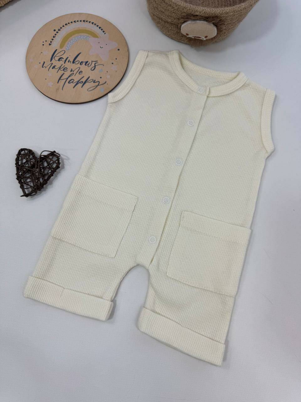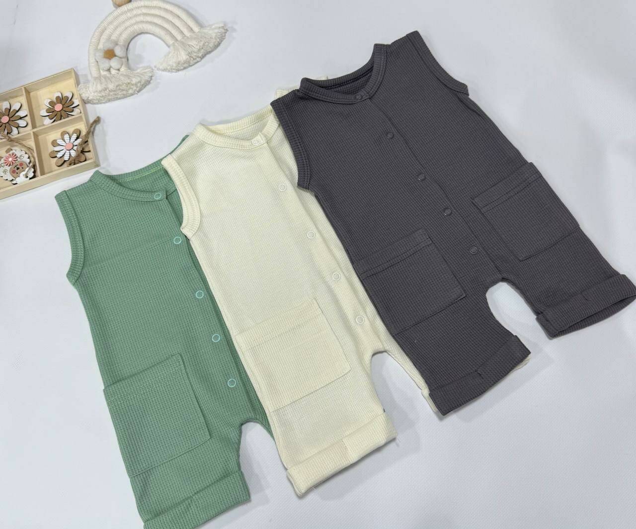 Лёгкий песочник для малышей — идеальный выбор для лета. Выполнен из ткани интерлок вафля — это 100% хлопок с приятной текстурой, которая отлично дышит и не вызывает раздражений на коже младенца.