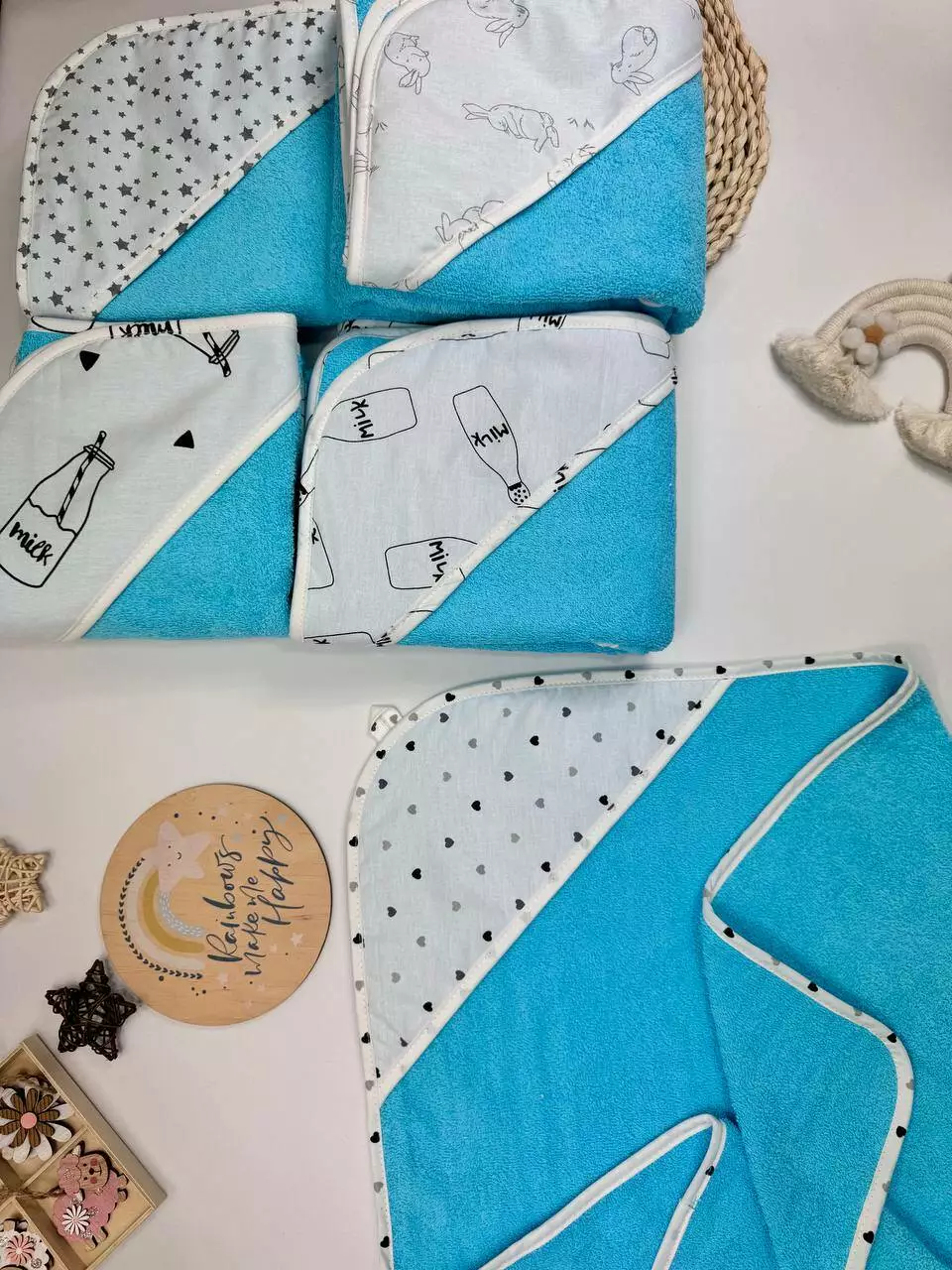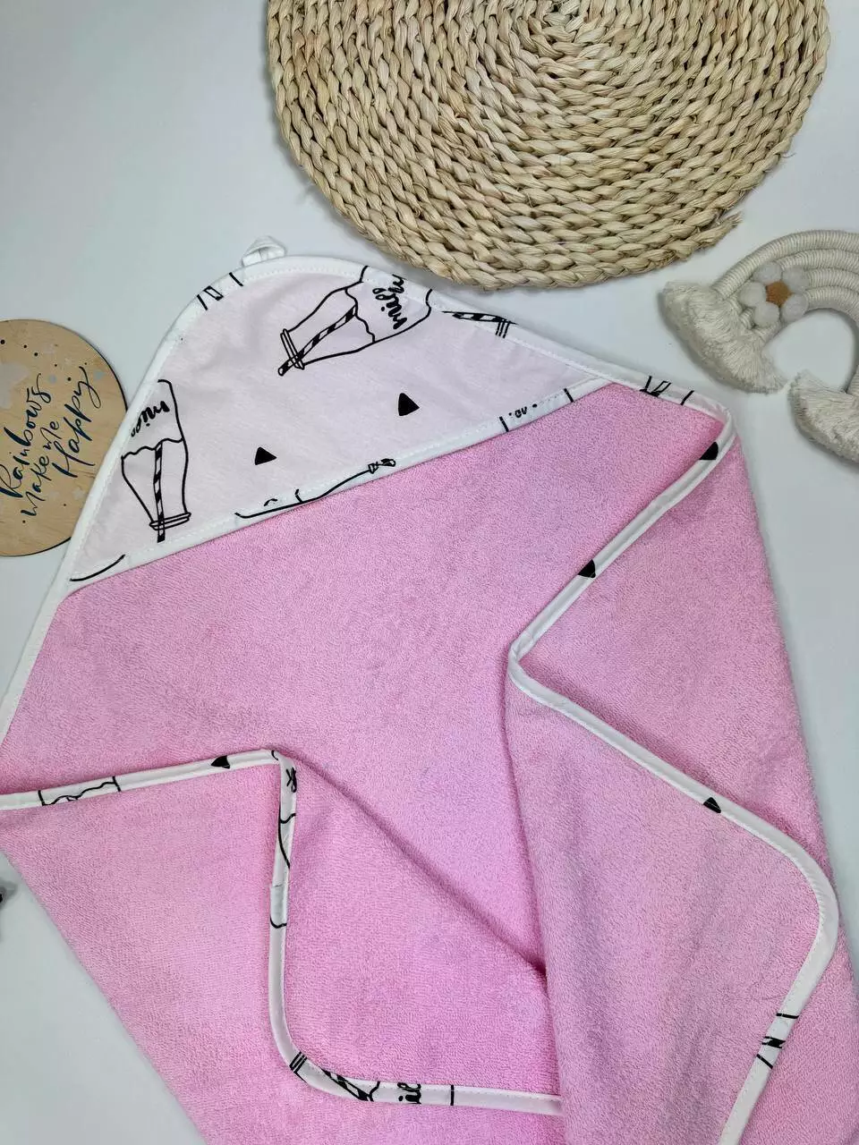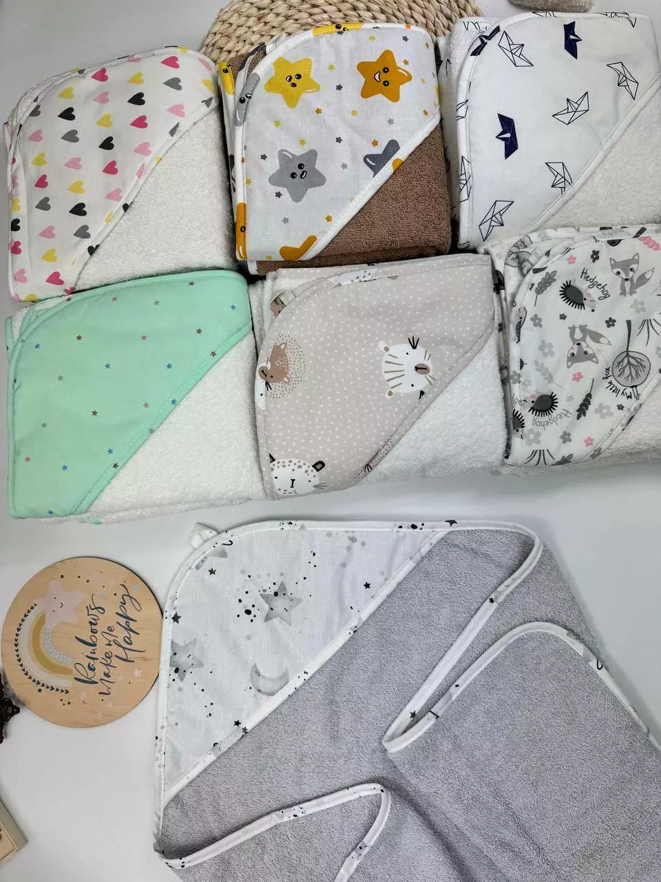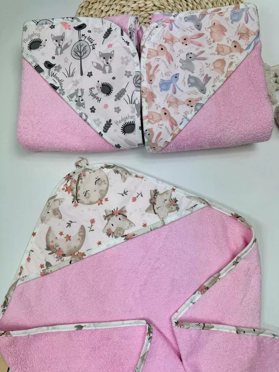 Опис: М'який і зручний кутик з комбінації бавовни та махри, ідеальний для ніжної шкіри вашого малюка. Ця тканина забезпечує відмінну теплоізоляцію і м'якість, що робить кутик ідеальним для обгортання малюка після купання або на прогулянках.